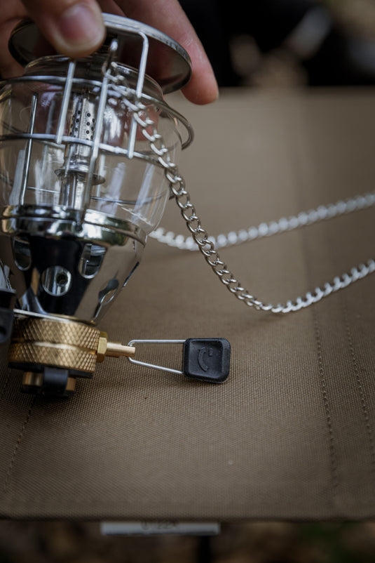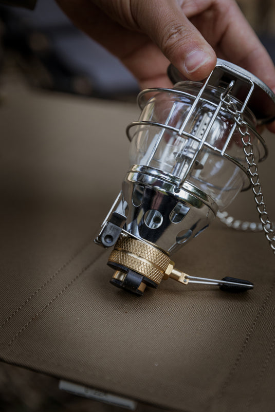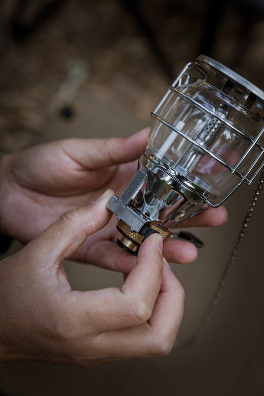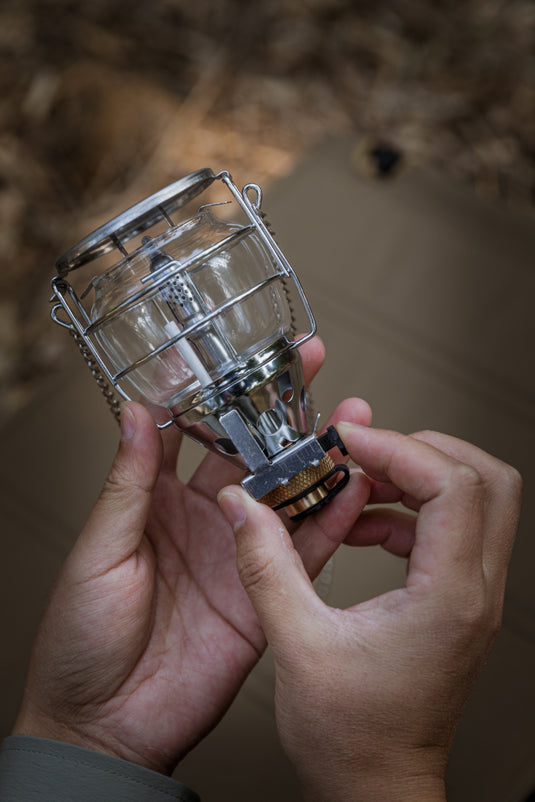 3. Burn-In the Mantle Reattach the glass globe & ventilator. Keep the canister level and screw in vertically. Tilting or overtightening may cause gas leaks or instability.