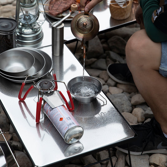 USED AS A MEASURING CUP/COFFEE CUP etc... As CAMPINGMOON sierra cup has measurement markings in the interior, you do not need another measuring cup for your instant food. You can also use CAMPINGMOON sierra cup as a coffee cup, soup bowl etc... as you need. You can put a burner directly in it and put the trivet or pot on it. The Sierra cup acts as a windshield, making cooking smoothly in windy areas.