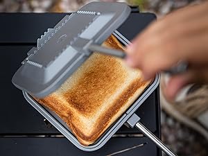 firmly sealing bread slices Securely lock with hooks on the handle for placing over fire. Ensures even delicate ingredients stay enclosed for tasty sandwiches.