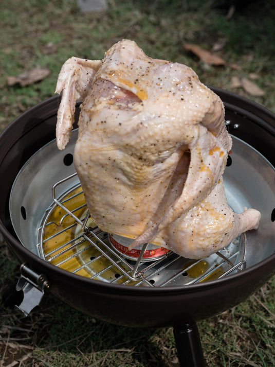 Place the chicken upright over the Beer Can Chicken Roaster.