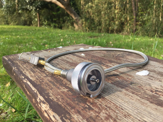 CONVENIENT AND SAFE TO USE By using with an extend hose(eg.Z16), it can connect an EN417 Lindal Valve canister to a butane gas stove and keep the canister having a safe distance from the heat source.