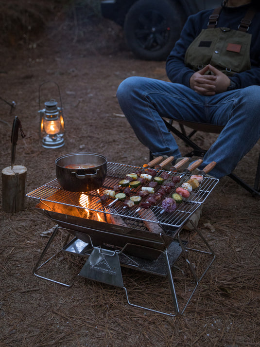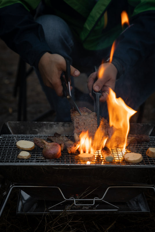 PORTABLE & COMPACT All parts can be folded into a compact size. By using attached carrying bag, easy to carry with and very convenient for barbecue, camping, backpacking, hunting and other outdoor occasions.