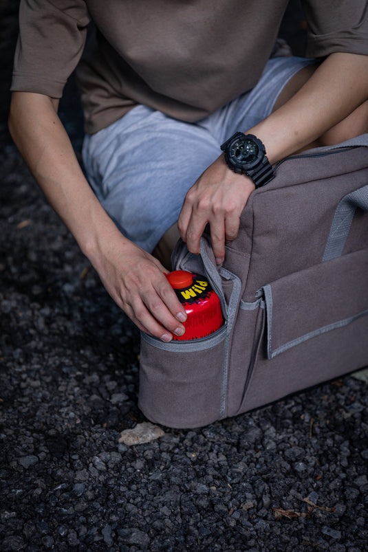 Side pockets for gas fuel can Two pockets on two sides of this burner's storage bag. You can put butane canister, Lindal valve isobutane canister or little propane canister in it.
